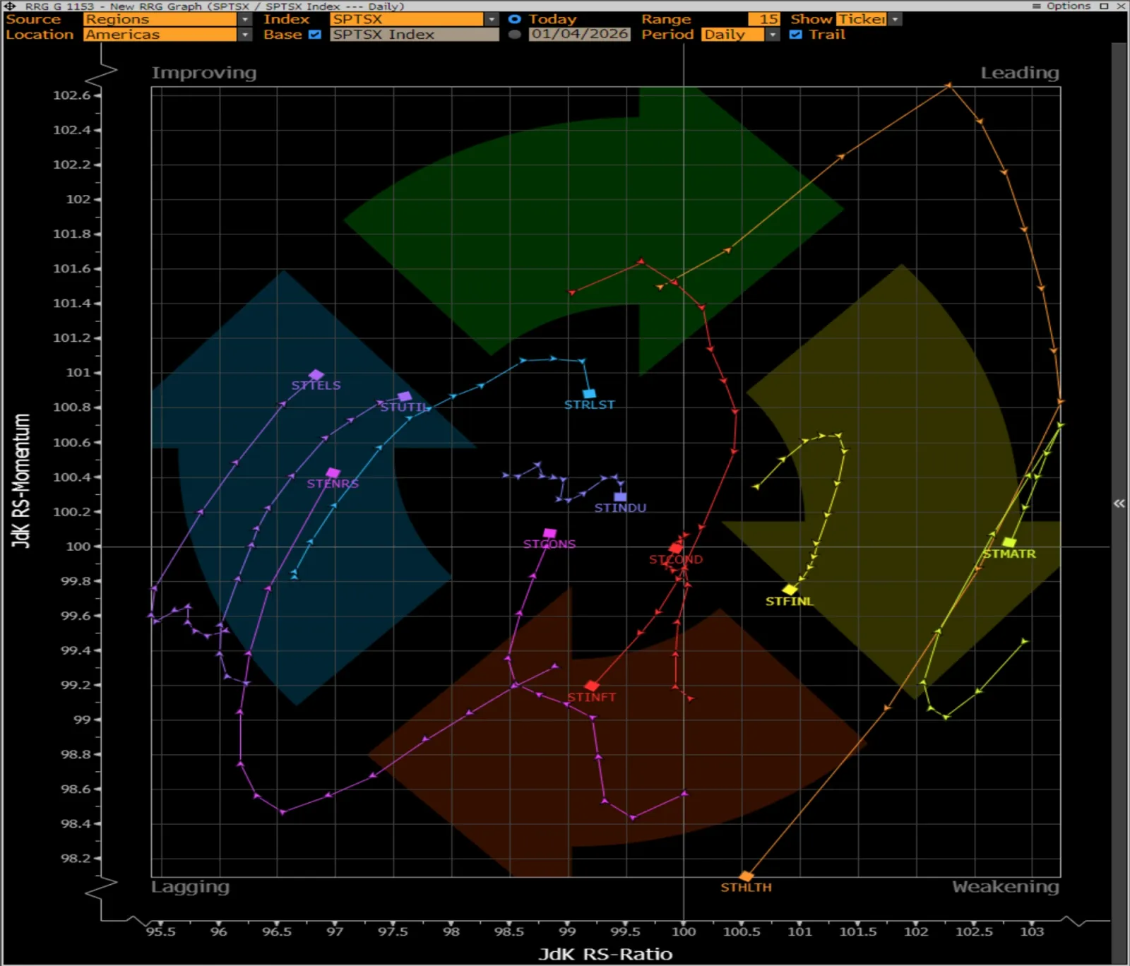 By plotting sector momentum against sector strength relative to the overall market we are able to visualize important shifts in sector changes and rotations with greater clarity: